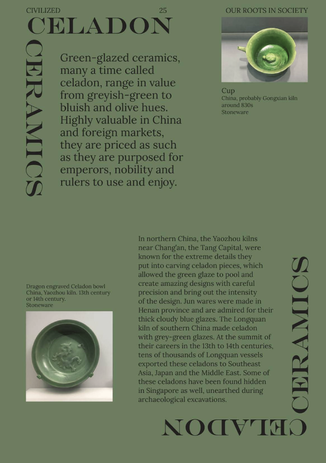 I fashioned the zine like a China tea set, as the Asian Civilization in regard to Singapore had a strong connection to many civilizations, but the most significant two were China and Malacca. I chose to focus on China for the elegant aesthetic that describes our heritage and History that we should be proud of. The special information pages were themed to be like Celadon, a form of China that is more fiercely prepared through intense heating to attain the green color in its body. This served as a highlight page theme for key informations.
